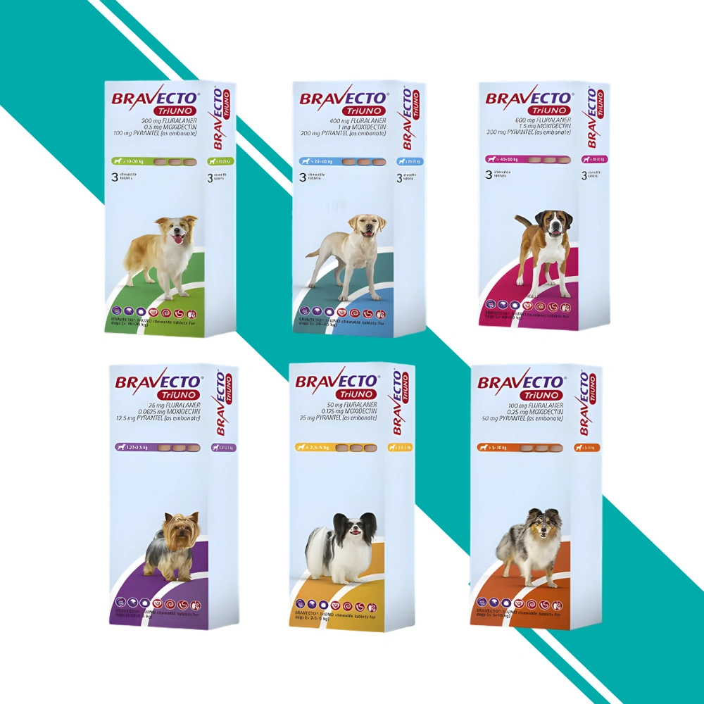 Bravecto TriUNO provides comprehensive monthly parasite protection for dogs at risk of mixed parasitic infestations. This advanced chewable treatment delivers broad-spectrum defence against fleas, ticks, gastrointestinal worms, lungworm, and heartworm in a convenient once-monthly tablet.