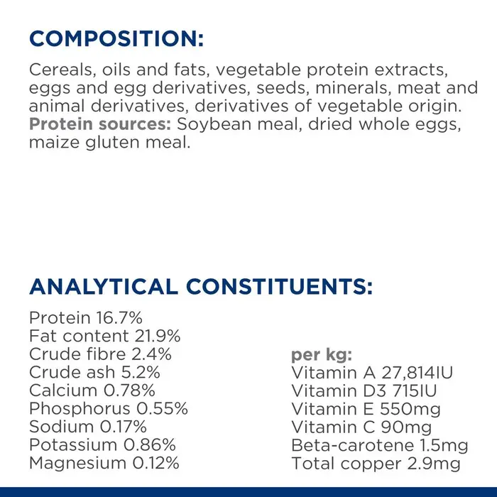 Composition: Cereals (maize), oils and fats (animal fat), vegetable protein extracts (soybean meal, maize gluten meal), eggs and egg derivatives (dried whole eggs), seeds (flaxseed), minerals, meat and animal derivatives, derivatives of vegetable origin (cellulose, dried beet pulp). Protein sources: Soybean meal, dried whole eggs, maize gluten meal. With a natural antioxidant (mixed tocopherols).