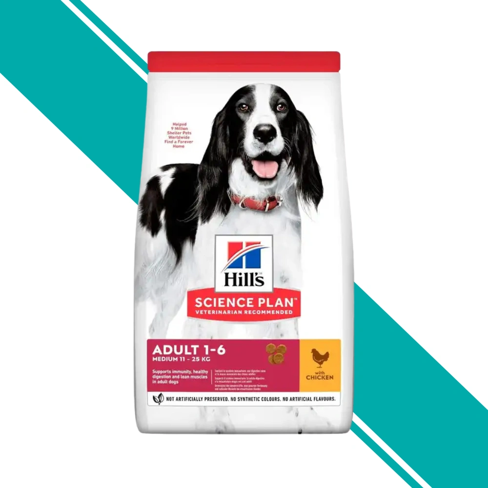 Complete dry food for medium breed adult dogs aged 1-6 years. High-quality chicken protein for lean muscles with omega fatty acids for skin and coat health.