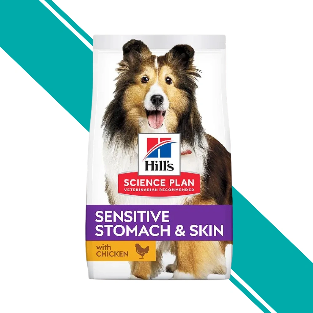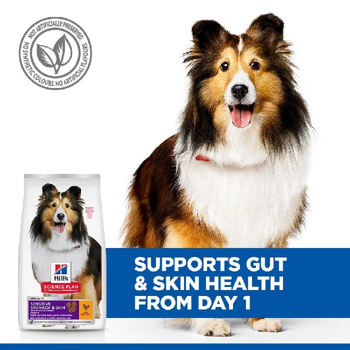 Hill's Science Plan Sensitive Stomach & Skin is a complete dry food formulated for adult medium breed dogs aged 1 year and over that are prone to digestive sensitivities and skin concerns. The recipe features dried beet pulp (2.5%), a nourishing prebiotic fibre source, developed to support healthy intestinal flora and optimal nutrient absorption. Enriched with omega-6 fatty acids (3.6%) and vitamin E to support the maintenance of healthy skin and a glossy coat. The protein content (22.8%) is derived from chicken (8%) and turkey meal (total poultry 12%), providing highly digestible nutrition. Made with natural ingredients and no artificial colours, flavours, or preservatives, with natural antioxidants for freshness.