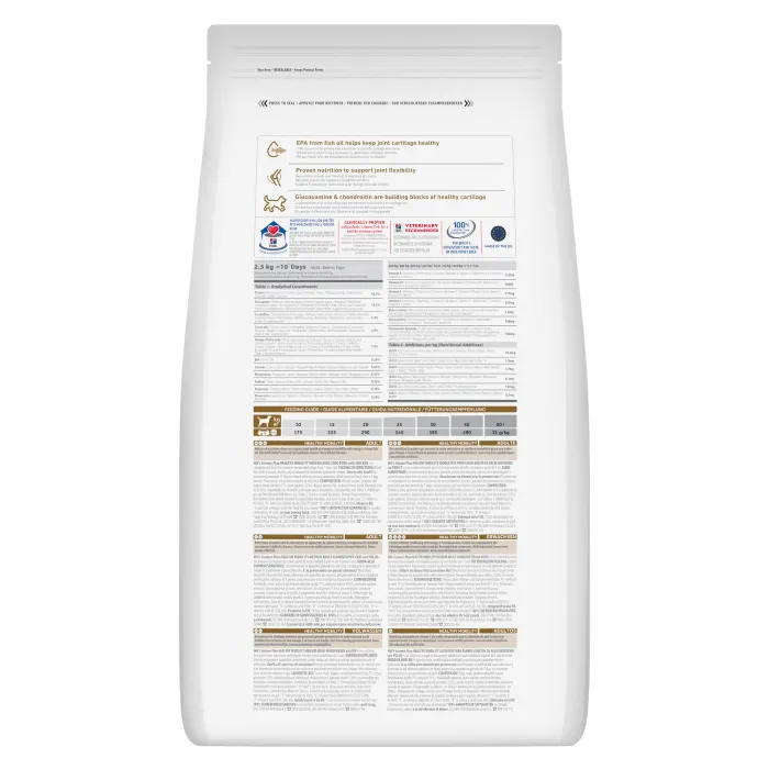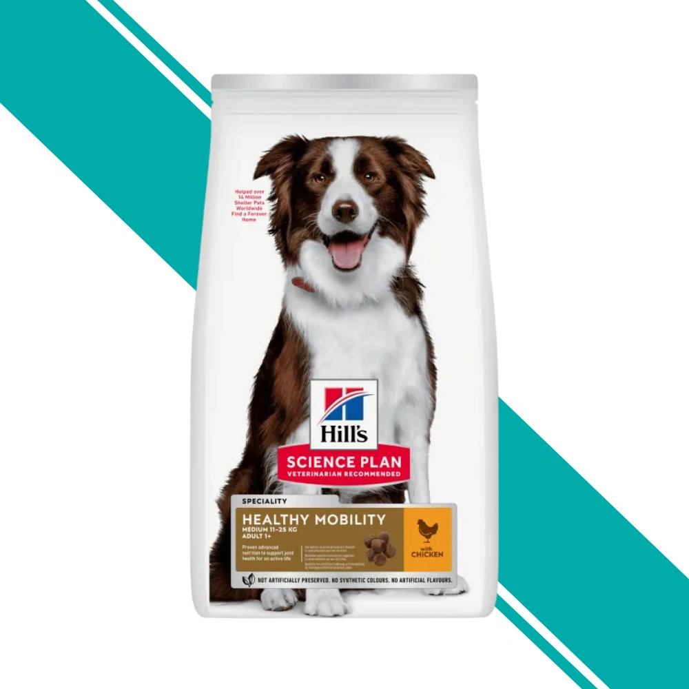 Hill's Science Plan Healthy Mobility Medium Breed Adult Dog Food with Chicken is specifically formulated to support joint health for an active life in medium breed dogs (11-25kg) aged 1 year and over. The formula contains EPA (0.29%) from fish oil which helps keep joint cartilage healthy. It is enriched with glucosamine (377mg/kg) and chondroitin sulphate (444mg/kg) which are building blocks of healthy cartilage. With 18.6% protein and 13.7% fat, it provides balanced nutrition while supporting joint flexibility and mobility.