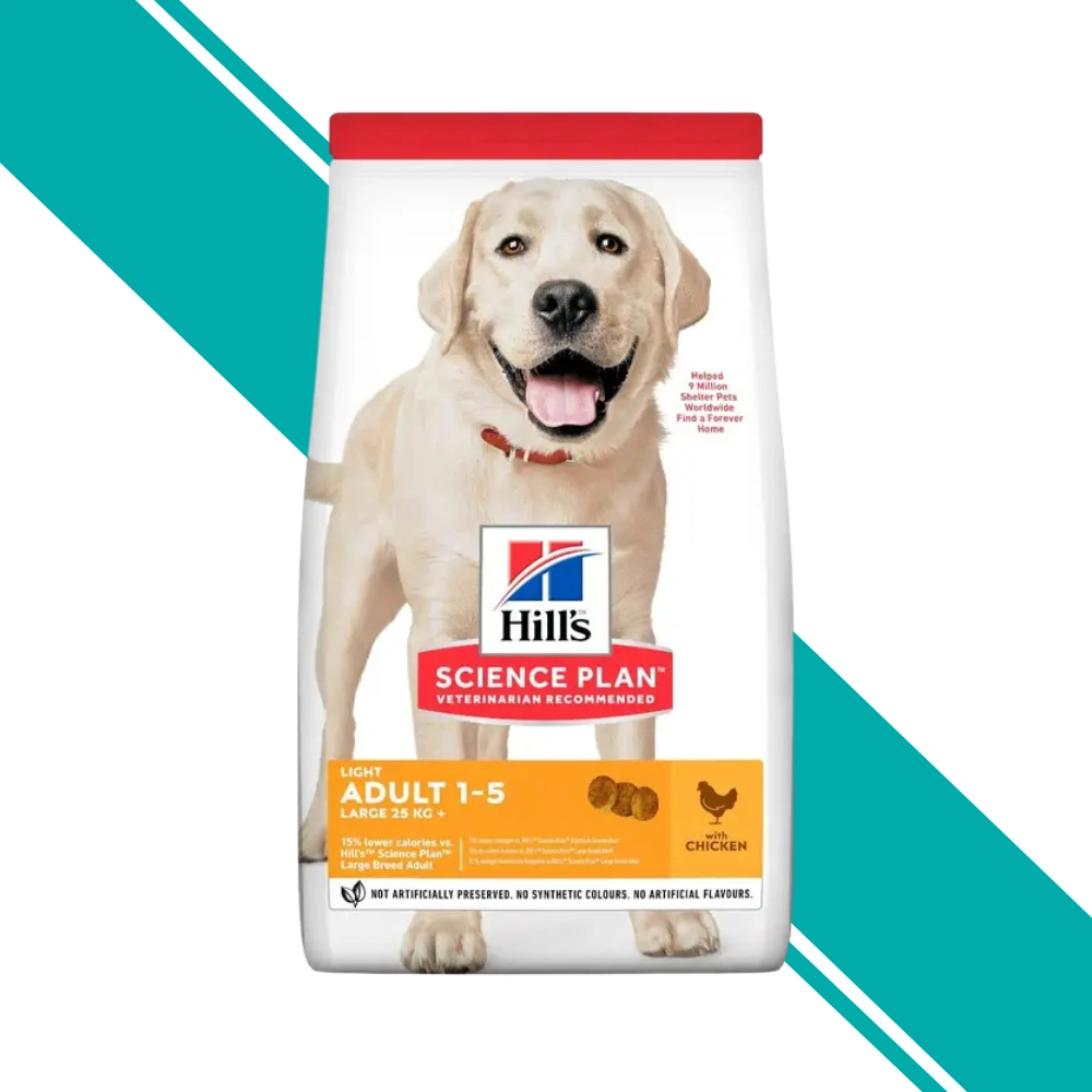 Hill's Science Plan Large Breed Light Dry Dog Food with Chicken is a complete pet food formulated with ActivBiome+ Multi-Benefit Technology for adult large breed dogs over 25kg from 1-5 years of age. This reduced calorie formula contains 23% protein and 9.5% fat with 312 kcal/100g metabolisable energy. The high fibre content (12.3%) supports satiety control, while L-carnitine (334.4 ppm) helps support healthy weight. Contains glucosamine (588 ppm) and chondroitin sulphate (609 ppm) for joint support, plus omega-6 fatty acids (2.89%) and Vitamin E for coat health.