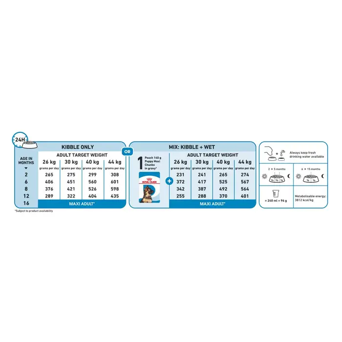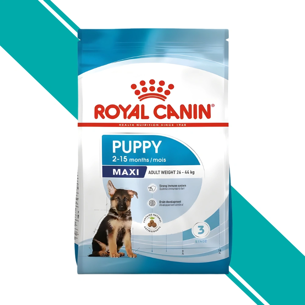 Royal Canin Maxi Puppy is specifically formulated for large breed puppies (expected adult weight 26-44kg) from 2 to 15 months old. The formula contains 30% protein and 16% fat with moderate energy content to support the extended growth period of large breed dogs while avoiding excessive weight gain that could stress developing joints. It includes a patented antioxidant complex with vitamins C (390mg/kg) and E (480mg/kg) to support the developing immune system. DHA (0.16%) from algal oil supports brain development and cognitive function. The combination of highly digestible L.I.P. proteins with prebiotics (FOS and MOS), beet pulp, and psyllium supports optimal digestive health. Glucosamine and chondroitin support developing joints. The kibble size and shape are designed for large breed puppy jaws.
