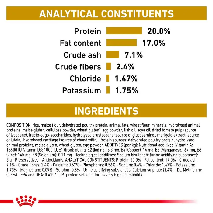 Composition: Rice, maize flour, dehydrated poultry proteins, animal fats, wheat flour, hydrolysed animal proteins, minerals, maize gluten, cellulose powder, wheat gluten (L.I.P. protein selected for very high digestibility), egg powder, fish oil, soya oil, dried tomato pulp (source of lycopene), fructo-oligosaccharides, glucosamine from fermentation, marigold meal, hydrolysed cartilage (source of chondroitin).