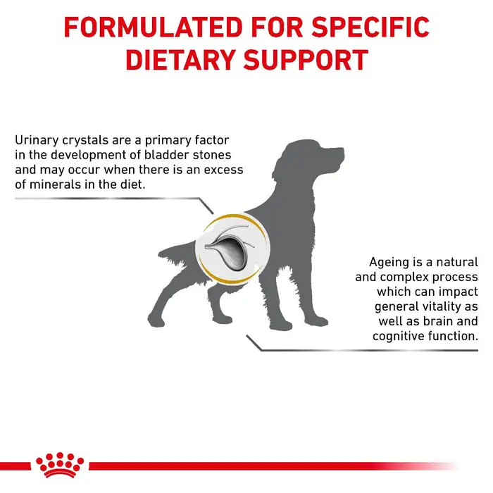 Specialist dietetic feed formulated for ageing dogs 7 years and over to support urinary health. Developed to dissolve struvite stones, with effectiveness for up to 80% of urinary stones. Contains an exclusive blend of nutrients and antioxidants to support cognition and vitality in ageing dogs. Features adapted mineral content and urine acidifying properties to help reduce calcium oxalate crystal formation. Highly palatable formula designed for ageing dogs that may have reduced appetite. Supports kidney health with controlled phosphorus levels.