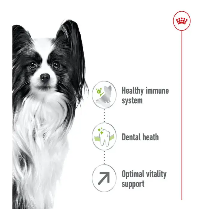 Royal Canin X-Small Adult 8+ is specifically formulated for very small breed dogs (up to 4kg) over 8 years old facing the first signs of ageing. The formula contains nutrients including EPA, DHA, and vitamin C to support a healthy immune system and overall vitality. A balanced intake of fibres including psyllium (1%) helps support digestive health and intestinal transit. Highly digestible L.I.P. proteins support optimal nutrient absorption. The very small kibble is adapted for miniature jaws and highly palatable to satisfy fussy appetites.