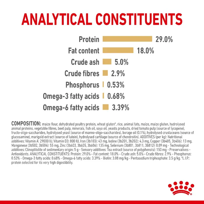 Composition: Maize flour, dehydrated poultry proteins, wheat gluten (L.I.P.), rice, animal fats, maize, maize gluten, hydrolysed animal proteins, vegetable fibres, beet pulp, minerals (including pentasodium triphosphate 0.35%), fish oil, soya oil, yeasts products, dried tomato pulp (source of lycopene), fructo-oligosaccharides, yeasts (source of manno-oligosaccharides), borage oil (0.1%), glucosamine from fermentation, marigold meal, hydrolysed cartilage (source of chondroitin). L.I.P.: protein selected for its very high digestibility.