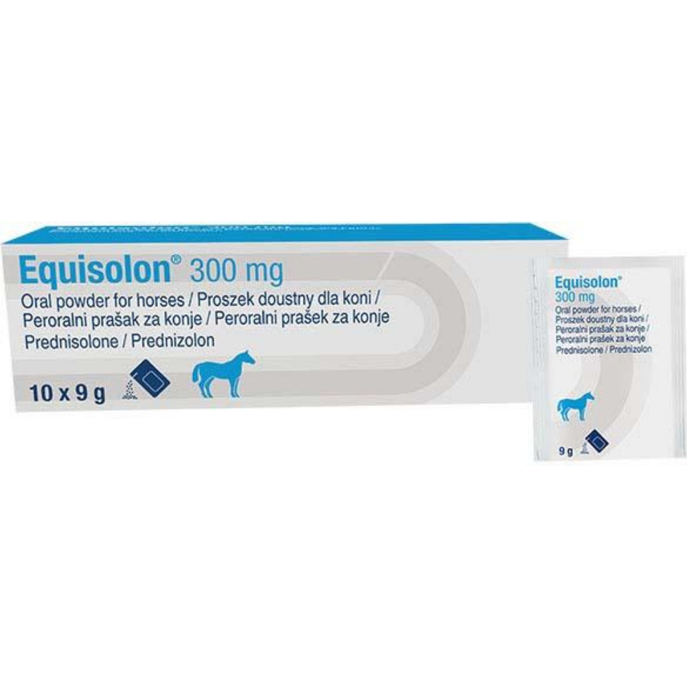Equisolon 300 mg Oral Powder (Equisolon 33 mg/g Oral Powder for Horses) is a prescription-only corticosteroid powder containing prednisolone 33.3 mg per gram as its active substance, licensed for use in horses. Prednisolone is an intermediate-acting synthetic glucocorticoid with approximately four times the anti-inflammatory activity of cortisol — it suppresses the immunological and inflammatory response by inhibiting capillary dilatation, leucocyte migration and phagocytosis, and exerts a metabolic effect through increased gluconeogenesis. The white to off-white oral powder is supplied in pre-measured sachets for convenient single-dose administration, mixed into a small amount of food. It is a POM-V product requiring a valid veterinary prescription, and is described as the only oral corticosteroid powder formulation registered for horses in the UK.